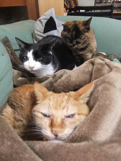 昼間、試しにビリーちゃんを家に入れ、マミーちゃん、プリンちゃんの寝ている傍に連れて行くと、マミー、プリンは何事もないように平気な顔(下写真)。ビリーちゃんは外を見ながら泣き通しでした。家の中に入れて慣れてくれるか心配です。いきなり二階の部屋ではね・・・少しの時間でしたが、毎日様子を見る為に入れてみます。