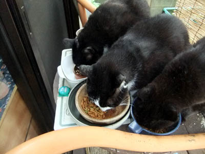 そして三匹仲良く並んでお食事タイム(下写真)。こうした光景が見られるのが平和なんですけどね。食後もずーっと庭に居てくれたので嬉しいです。