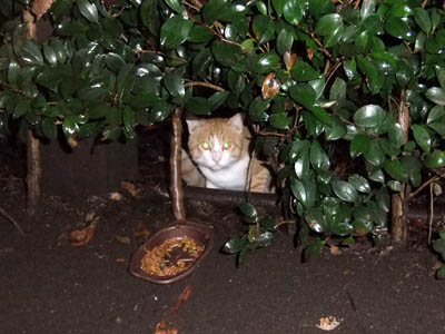 今日はリリーちゃんは来なかったので良かった~。ところが又見かけない尾っぽの長い茶色の成猫発見(下写真)。ナナちゃんは尻尾が短いので違うし、一見亡くなったウメちゃんと体つきが似ていましたが別猫でした。お皿にご飯を入れて持って行くと少し警戒。でもちゃんと食べていましたよ。