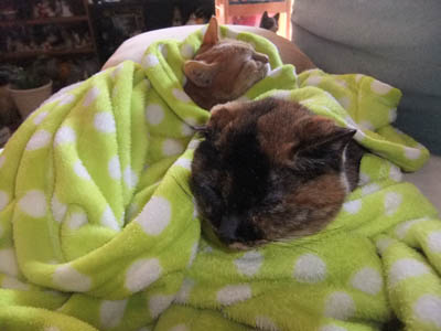 最近、家のプリンはマミーちゃんの様に突然走り出して鳴く事があります。ソファの下から「ミャーミャー」と何度も何度も鳴き続けるんですよ。何を思っているんでしょうね。最近涼しくなったので二匹仲良く毛布にくるまって寝ています。(下写真)