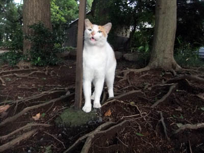 神社ではヤヤちゃんが食後も遠くから私の方を見ているんです(下写真)。以前は食べ終わると帰って行ったのに・・・甘えたいのかと思って撫でようとすると逃げるんですよ。「また明日ね~」